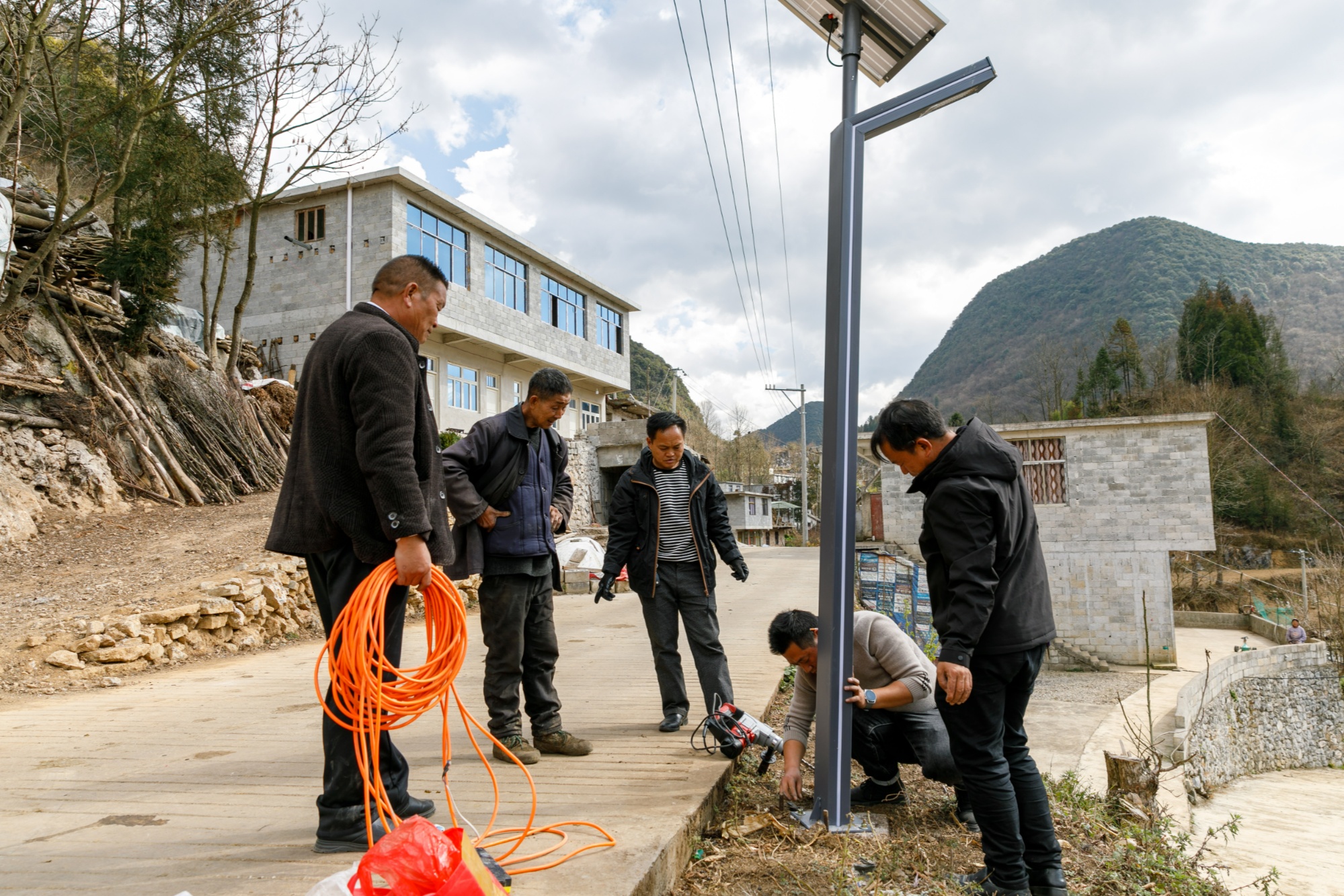 近日,走进贵州省六盘水市水城区海坪街道甘塘村阿尼克组,只见不少村民正在分工协作、齐心协力安装串户路两侧的太阳能路灯。目前,路灯安装工作即将结束,看着眼前一盏盏的路灯,村民们的喜悦之情溢于言表。