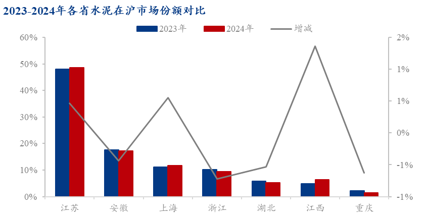 上海水泥需求主要由江、浙、皖、赣、鄂、渝等地区供给,其中长三角区域的份额占比达87%,较去年基本持平,长三角水泥供给状况直接影响着上海水泥消费市场。