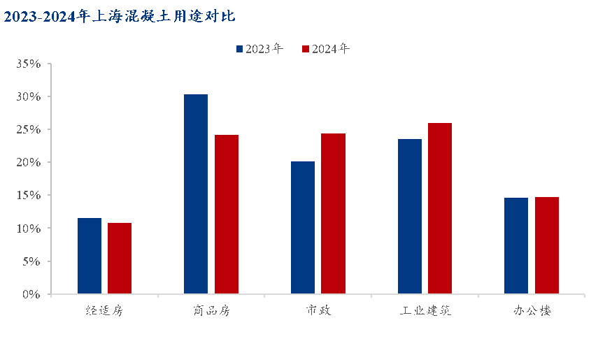 2024年上海混凝土用量5700万方,从用途统计来看,其中经适房、商品房较去年占比均有下滑,市政、工业建筑占比有所上升。经适房占比约11%,商品房占比约24%,市政占比约24%,工业建筑占比约26%,办公楼占比约15%。商品房、经适房用量下降,市政、工业建筑用量有所上升,且工业建筑占比变为最高。预估2025年上海混凝土用量约5000万方。