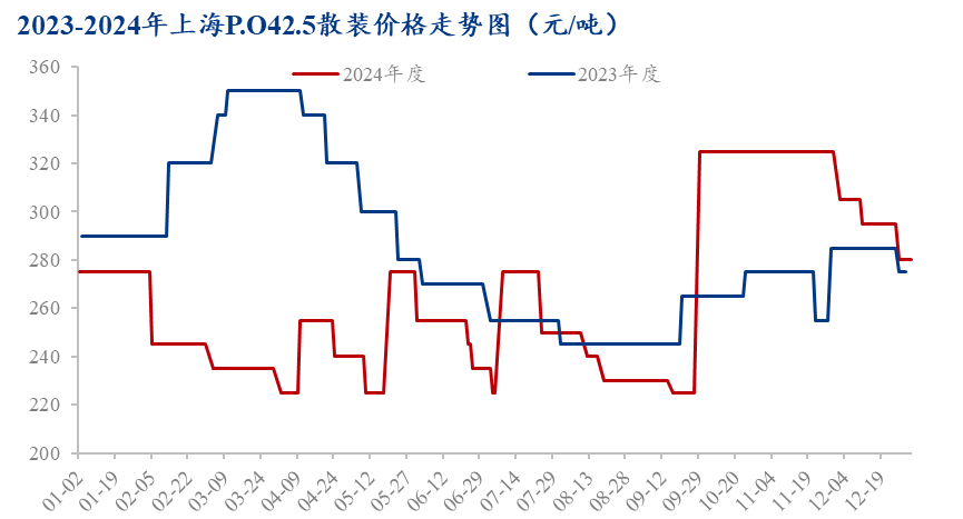 2024年上海主流品牌P.O42.5散装水泥市场均价270元/吨,同比下跌7%,最高值325元/吨,出现在9月底,是因企业亏损,沿江水泥生产企业大幅拉涨价格;最低价235元/吨,出现在3月、5月、7月、9月。2024年水泥收官价280元/吨,价格总体呈现震荡下滑。
