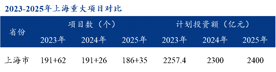 2024年,上海市重大工程完成投资2383亿元,完成年初计划103.6%,同比增长5.6%。2025年重大工程投资计划2400亿元。
