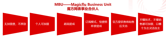 在演讲的最后,魔方恒久CEO模范邀请列席的软件代理商加入魔方网表,成为事业合伙人(MBU)。这项合作模式可以以个人的名义申请,无需任何加盟费的同时还能获得超高提成,魔方恒久软件公司会为所有MBU提供售前售后各类支持,即便不懂技术、不懂销售也能加盟。